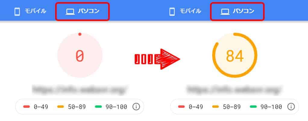 下記のように、PageSpeed Insights の値が、大幅に改善されます。Divi をインストールした状態が左、フォントをメイリオに変更したときの値が右になります。