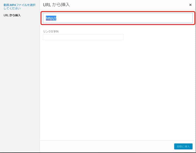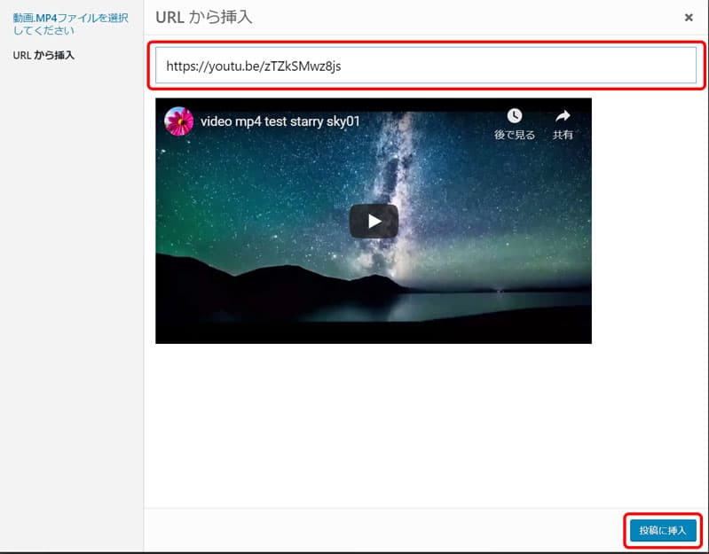 ![]() | コピーした URL を入力し「投稿に挿入」をクリックします。 |