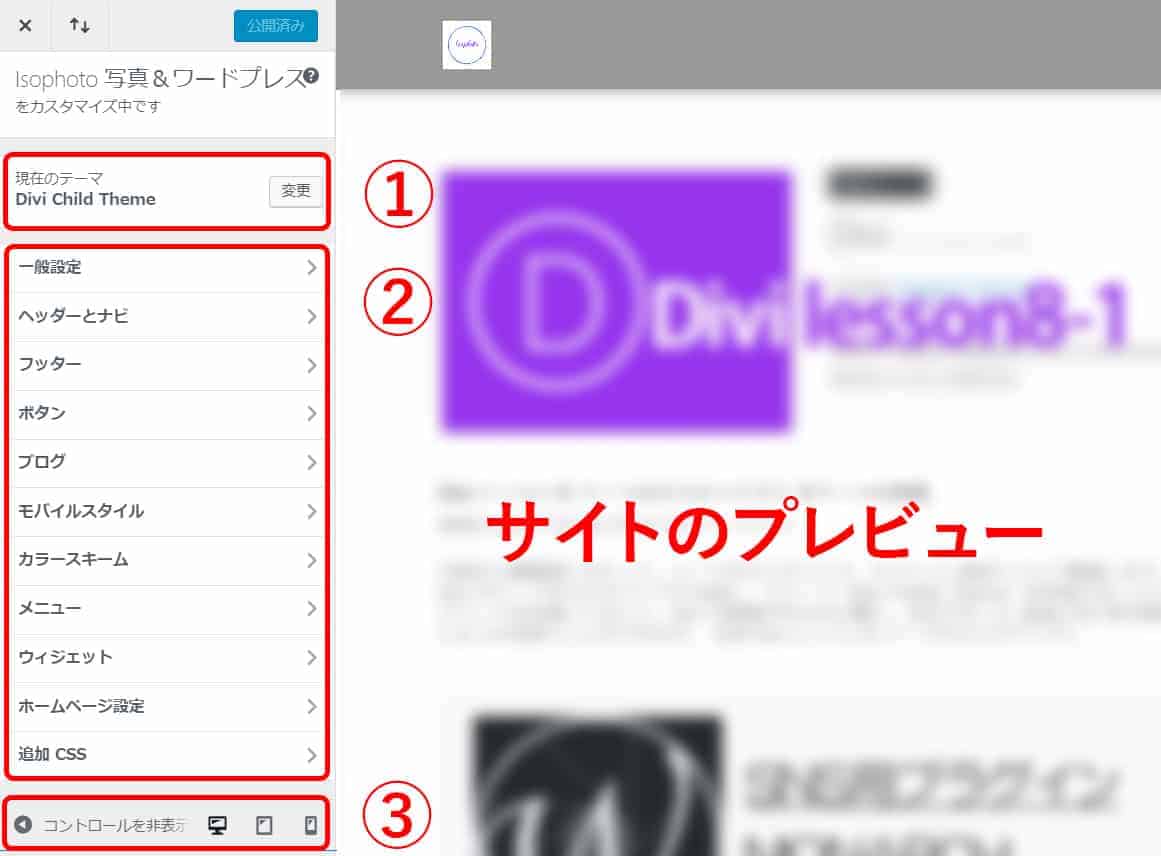 今回は Divi テーマのカスタマイズのうち、「外観」>「カスタマイズ」の項目で設定できる内容について図解します。