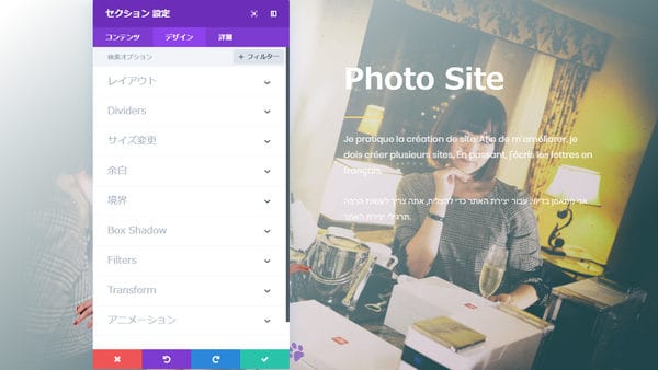 Divi Builder の設定のデザインタブで設定できる項目として、セクションの Dividers と、デザイン設定のうちのアニメーションについてはすでに説明しました。今回はその他に設定できる項目についてみてみることにしましょう。