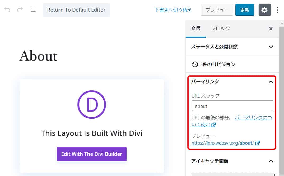 各ページのURLは、ページの編集画面の「パーマリンク」で確認できます。