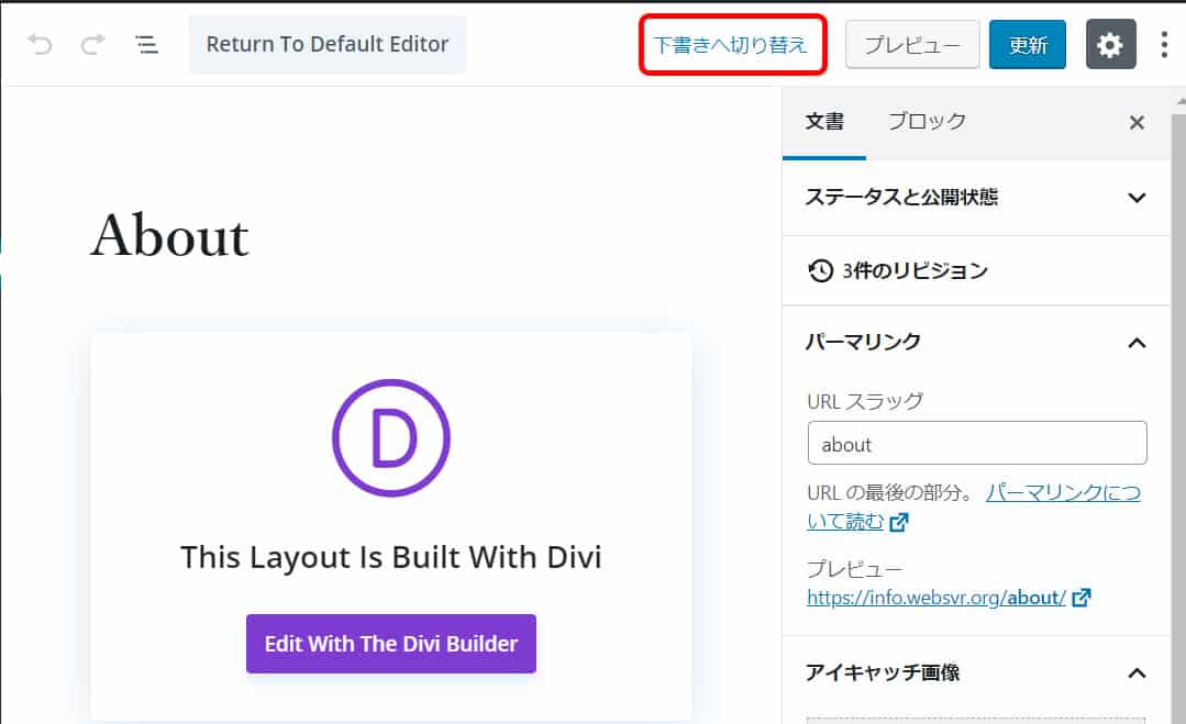下記のように表示されたページの、右上方にある「下書きへ切り替え」をクリックします。
