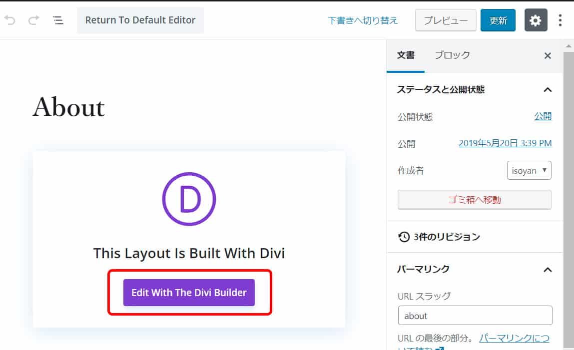 下記のように表示されます。 Divi Builder で編集をする場合は「 Edit Width The Divi Builder 」をクリックします。