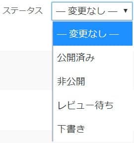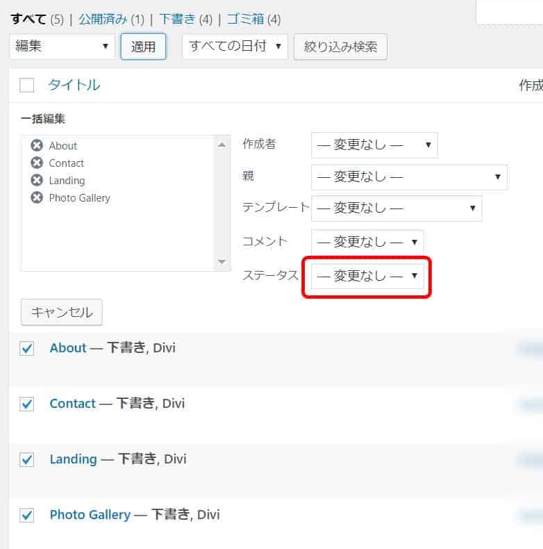 ![]() | あるいは、一括編集でステータスを「下書き」にして「更新」をクリックします。 |