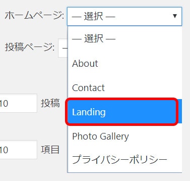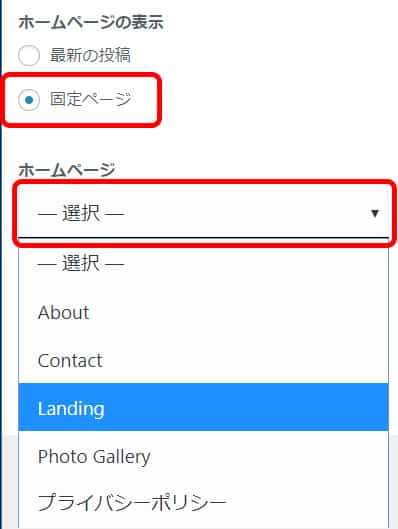 ![]() | ホームページの表示を「固定ページ」として、ホームページで「Landing」を選択します。 |