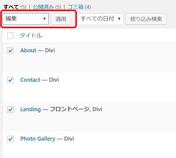 ![]() | 公開したいページにチェックを入れて、「一括操作」となっている部分をクリックして「編集」に変え、「適用」をクリックします。 |