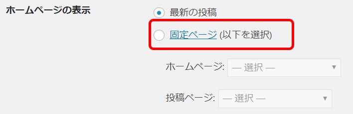 ホームページの表示設定が表示されるので、ラジオボタンを「固定ページ」に変更します。
