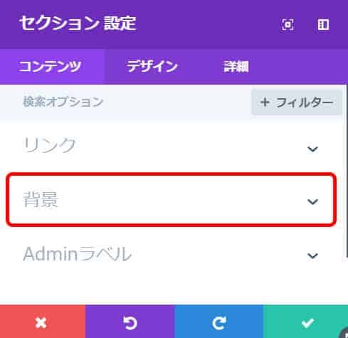 セクション設定の「コンテンツ」タブの「背景」をクリックします。