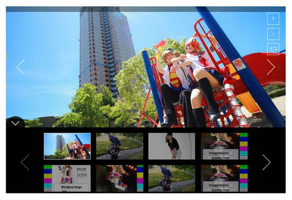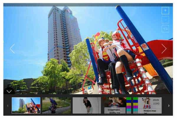 下記のように表示されます。 Default Theme では、写真を中央に拡大表示し、下にサムネイルのバーがつく構造となります。このギャラリーはサイトの訪問者が自由に表示写真を選べるだけでなく、自由に拡大縮小したり、全画面表示したりできるようになっています。無料ですが非常に高機能で素敵なギャラリーです。