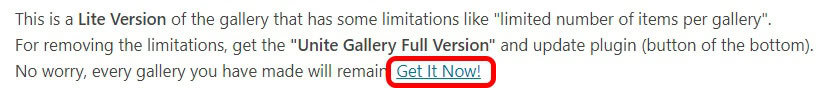 Unite Gallery と Unite Gallery Lite の最も大きな違いは、Lite の方はひとつのギャラリーに追加できる写真の枚数に12枚という制限があることです。12枚は少ないですが、複数のギャラリーの作成はもちろん可能ですので、12枚でも使い方によっては十分と判断される場合もあるでしょう。Lite をインストールして使ってみることによって、Unite Gallery の購入を決める前に、十分にテストができます。また、Lite で作成したギャラリーは、Unite Gallery を購入した後で継続して利用可能ですので、気軽にテストが可能です。